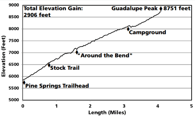 The trail to the top of Guadalupe Peak is just over four miles, but it’s all uphill. The National Park Service has rated this hike as strenuous because the trail steadily rises 3,000 vertical feet along the way. They are not kidding when they say strenuous. It was very strenuous.