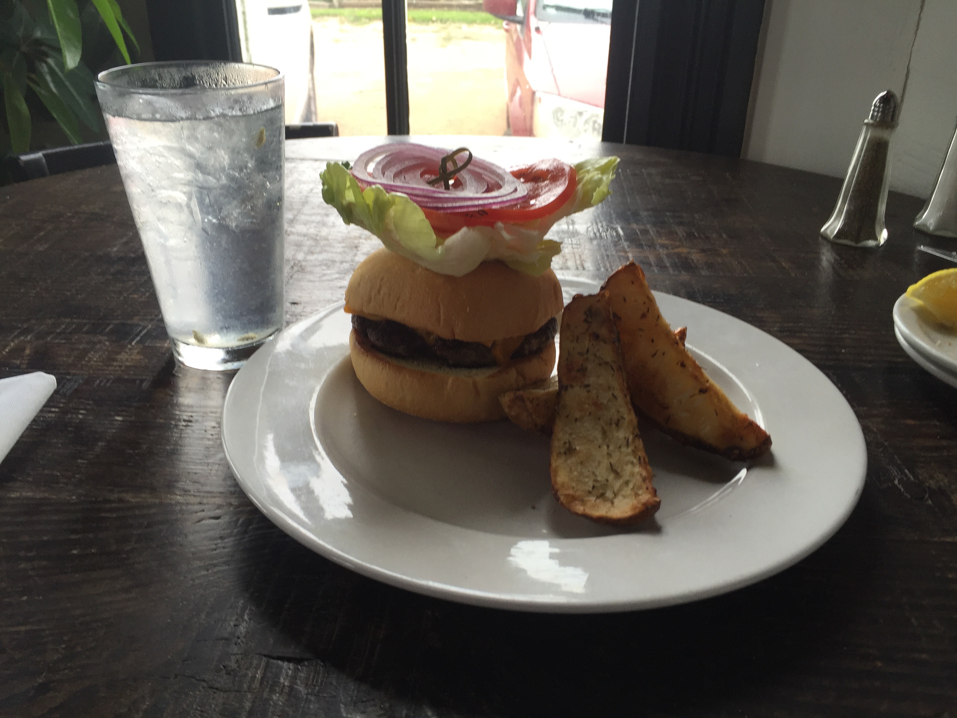 The selections on the menu looked amazing. Wish I could have ordered a sampling of everything, but I was there to eat a hamburger. So, I ordered the Plain Jane — just a simple burger. The Plain Jane has a patty made of a blend of chuck and brisket topped off with an ample melted portion of aged sharp cheddar. The meal is served with oven roasted potato wedges, lettuce, tomato, and red onion on the side.