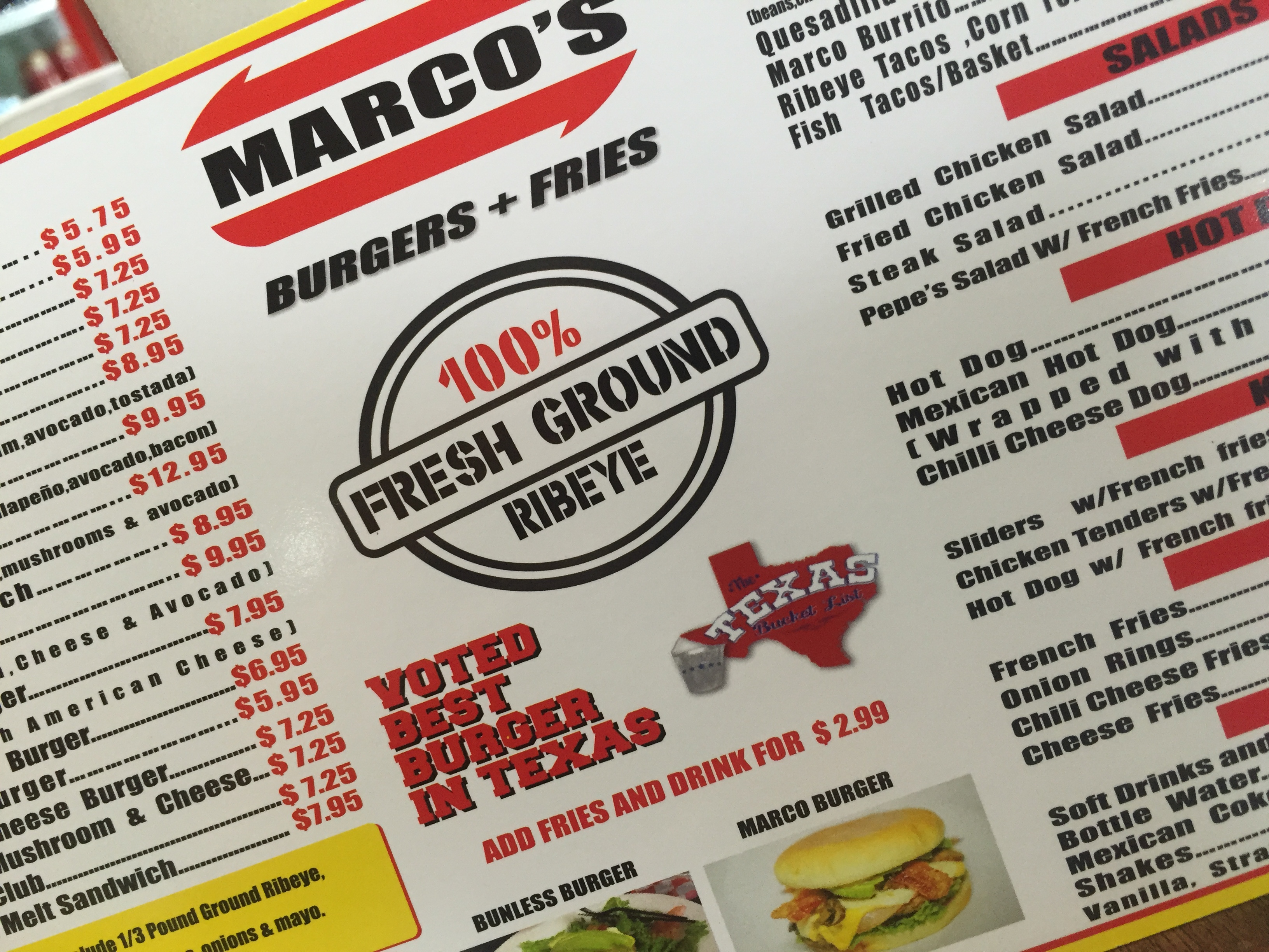 On a recent road trip to the Rio Grande Valley, I visited Marco’s Burgers and Fries in my hometown of Mission. This turned out to be one of the best decisions I have made on my burger quest. Lots of places serve varieties of burgers distinguished by creative combinations of this or that added to a burger. Marco’s Burgers, however, takes the burger experience beyond the ordinary.