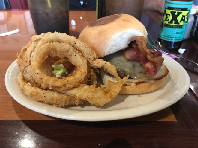 My bacon cheeseburger was a work of art in itself — with a healthy portion of perfectly cooked meat, crispy bacon, pepperjack cheese, moist buns, and fresh lettuce, tomato, and pickles. The first bite was a foretaste of what would be an absolutely delicious meal. Everything about this burger was right. This was an honest-to-goodness absolutely delicious burger. And the pepper-sprinkled onion rings certainly held their own as well. Delicious.