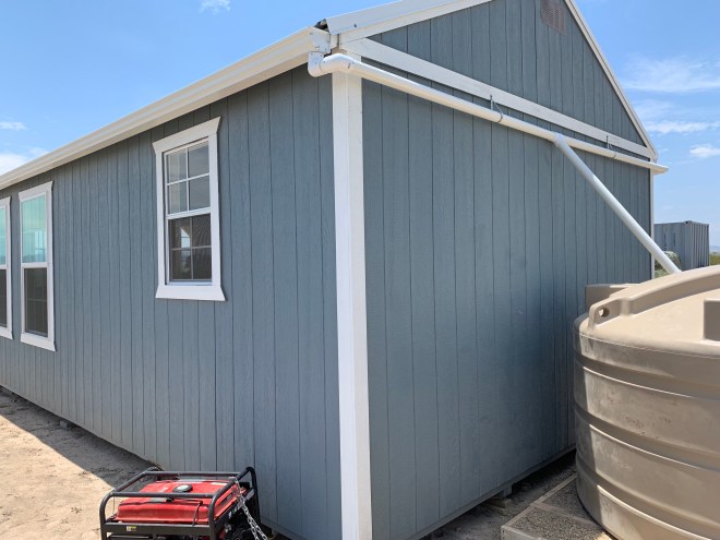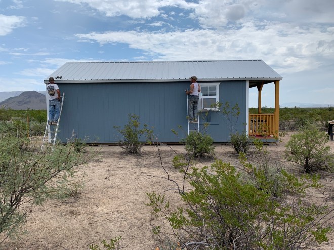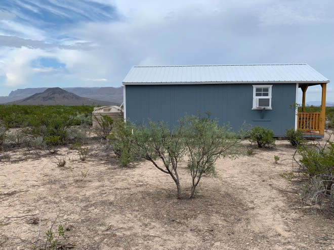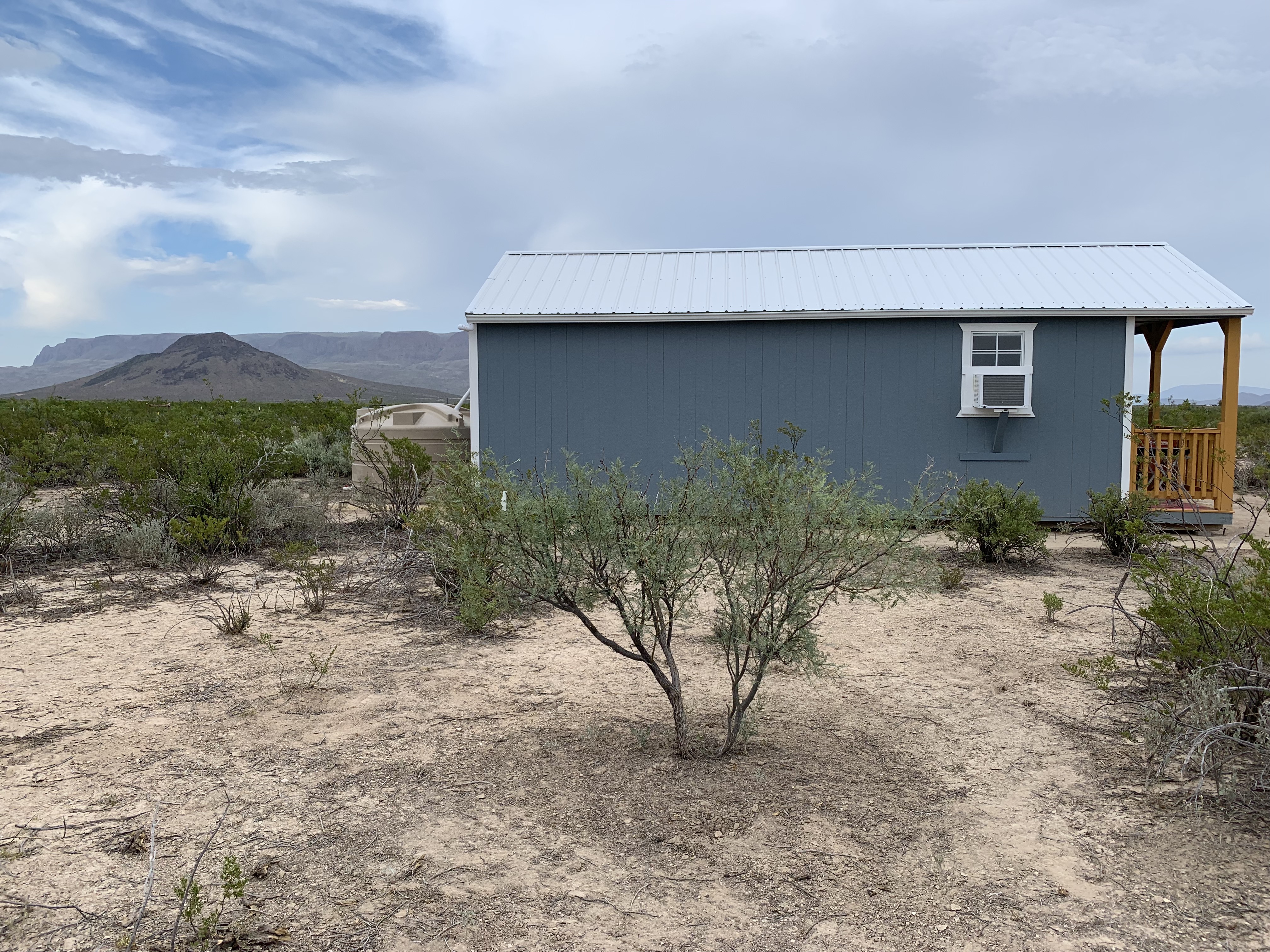 One of the considerations when ordering our cabin was the roof. Like so many roofs in the Big Bend area, we have a standing seam metal roof on our cabin especially for the purpose of rain catchment. We also purchased a 1,125 gallon water catchment tank fed by seamless gutters. We calculate that 1-inch of rain on our 420 square foot roof will capture as many as 260 gallons of water.