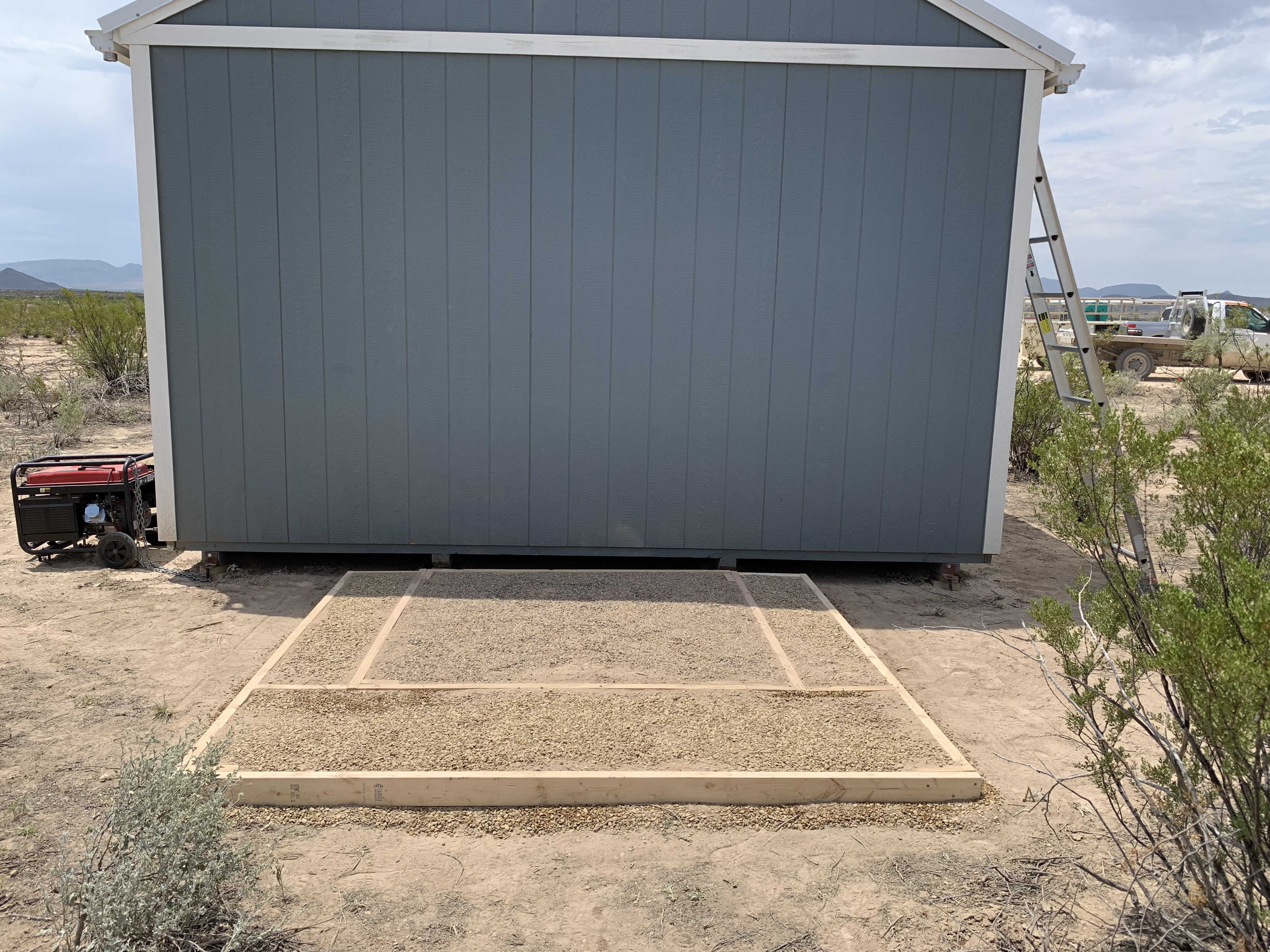 In preparation for the placement of our water catchment tank, Cheryl and I built a raised pad of tamped earth and pea gravel held in place by treated lumber. I will later add railroad ties to countersunk trenches around the pad to further strengthen it.