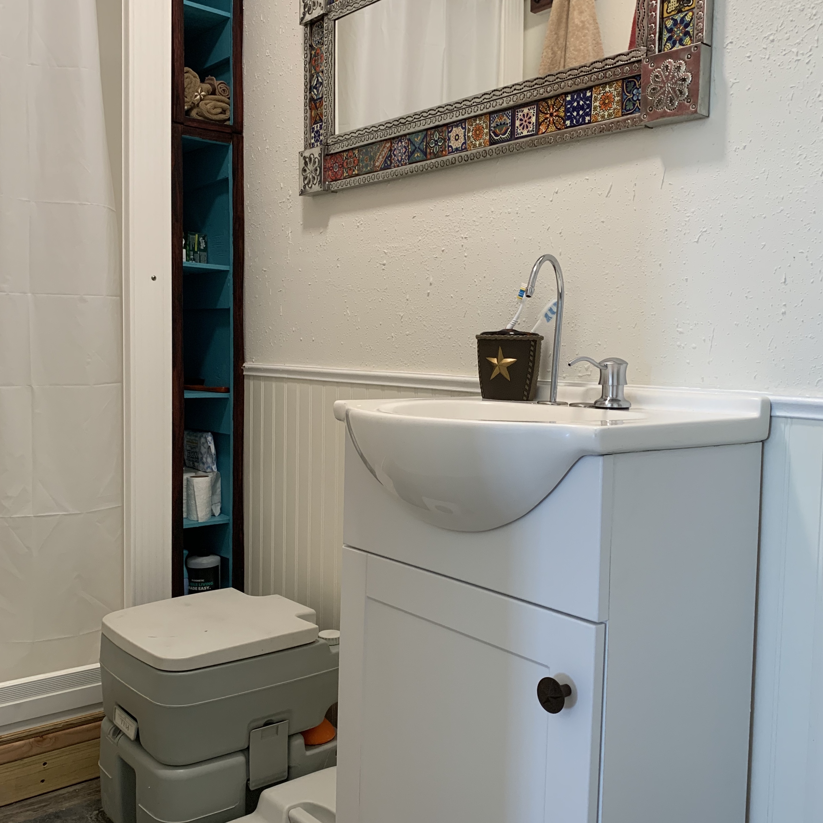 On our last trip to the cabin we added a small sink to our indoor bathroom. This adds just one more layer of comfort and convenience to our little place in the Chihuahuan Desert. Once I secured the vanity and sink to the wall, I jury-rigged parts from our old foot-pump sink to work on our new sink.