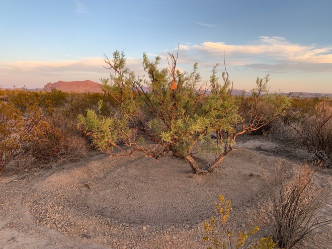 My buddy Selim accompanied me to do some work on our trees. I have been slowly working to add water catchment basins around the mesquites on the property. These catchment basins will allow us to capture as much water as possible from the infrequent rain that falls in the desert. The water in the basins will slowly seep into the area around the trees rather than just running off the property.