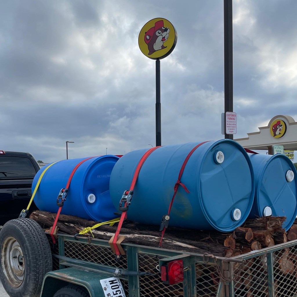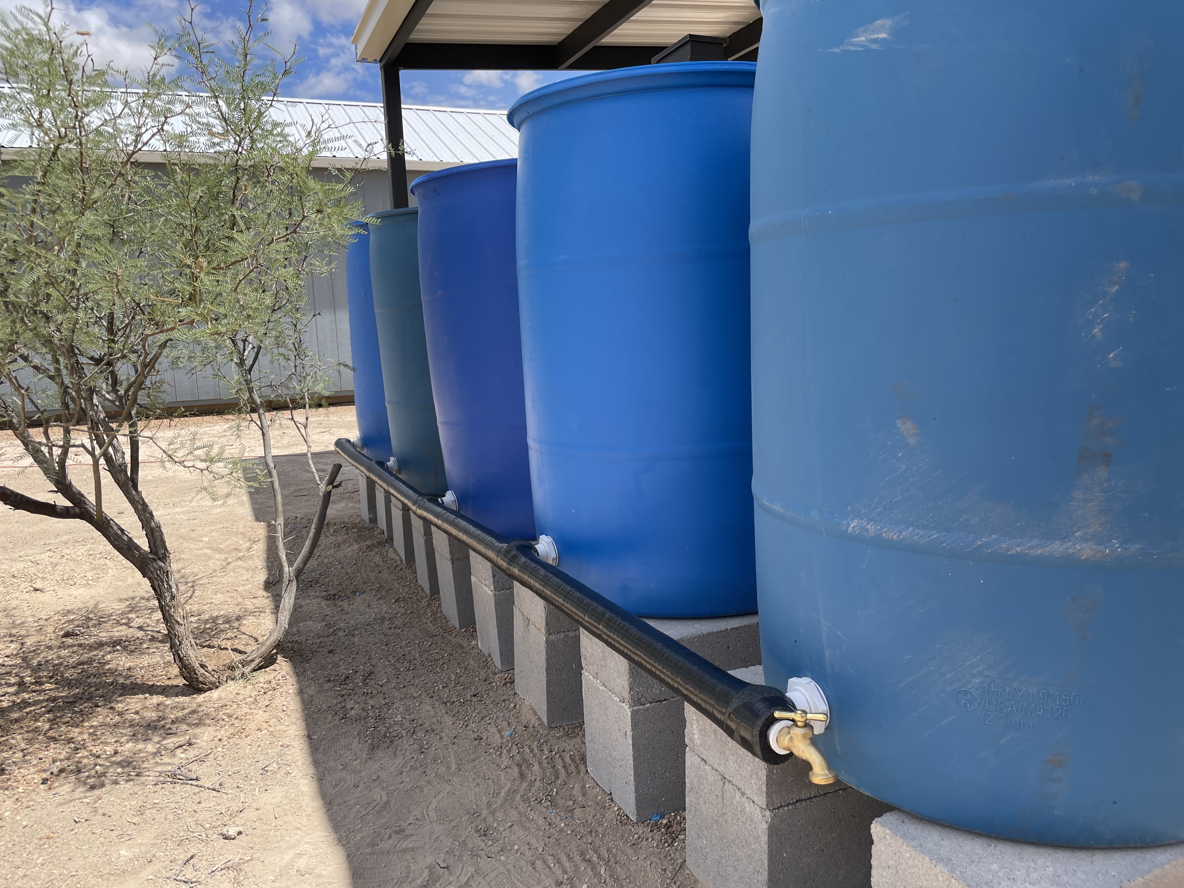 Once I leveled and lined up the barrels I added bulkhead fittings and linked them all together. These barrels will give us an additional 275 gallons of storage, bringing our total catchment capacity to 2075 gallons.