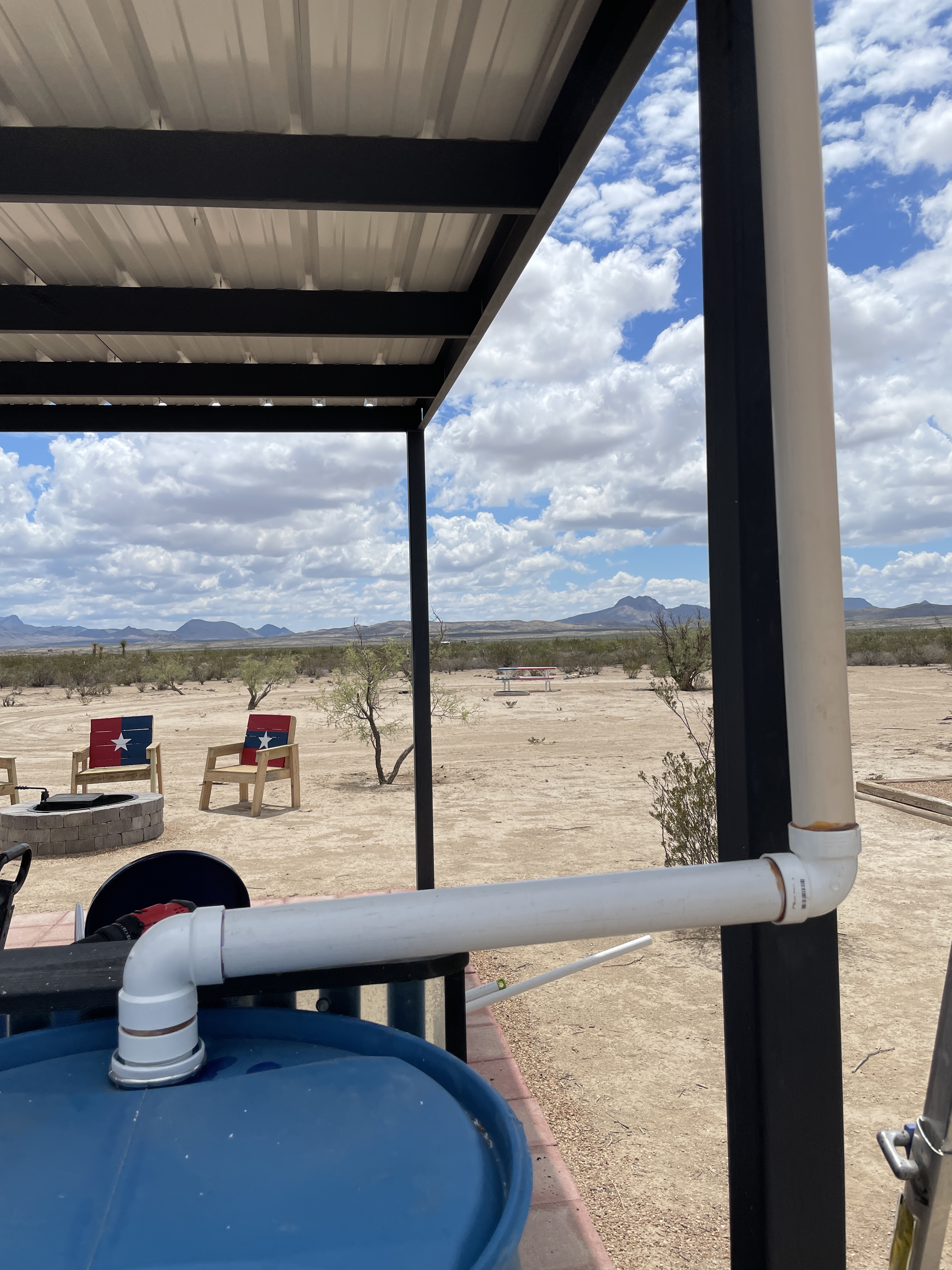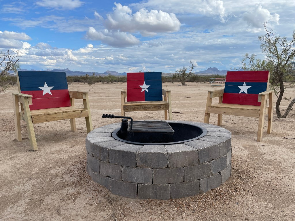 My first project was to utilize all of the scrap wood in our container to build some comfortable Texas-themed chairs for the fire ring adjacent to our shade structure. These chairs are fun to build, comfortable, and look great. I built three of them on the first day and a fourth on Sunday afternoon. They came in handy on Saturday evening when all of the neighbors came over for a hot dogs and s’mores cookout.