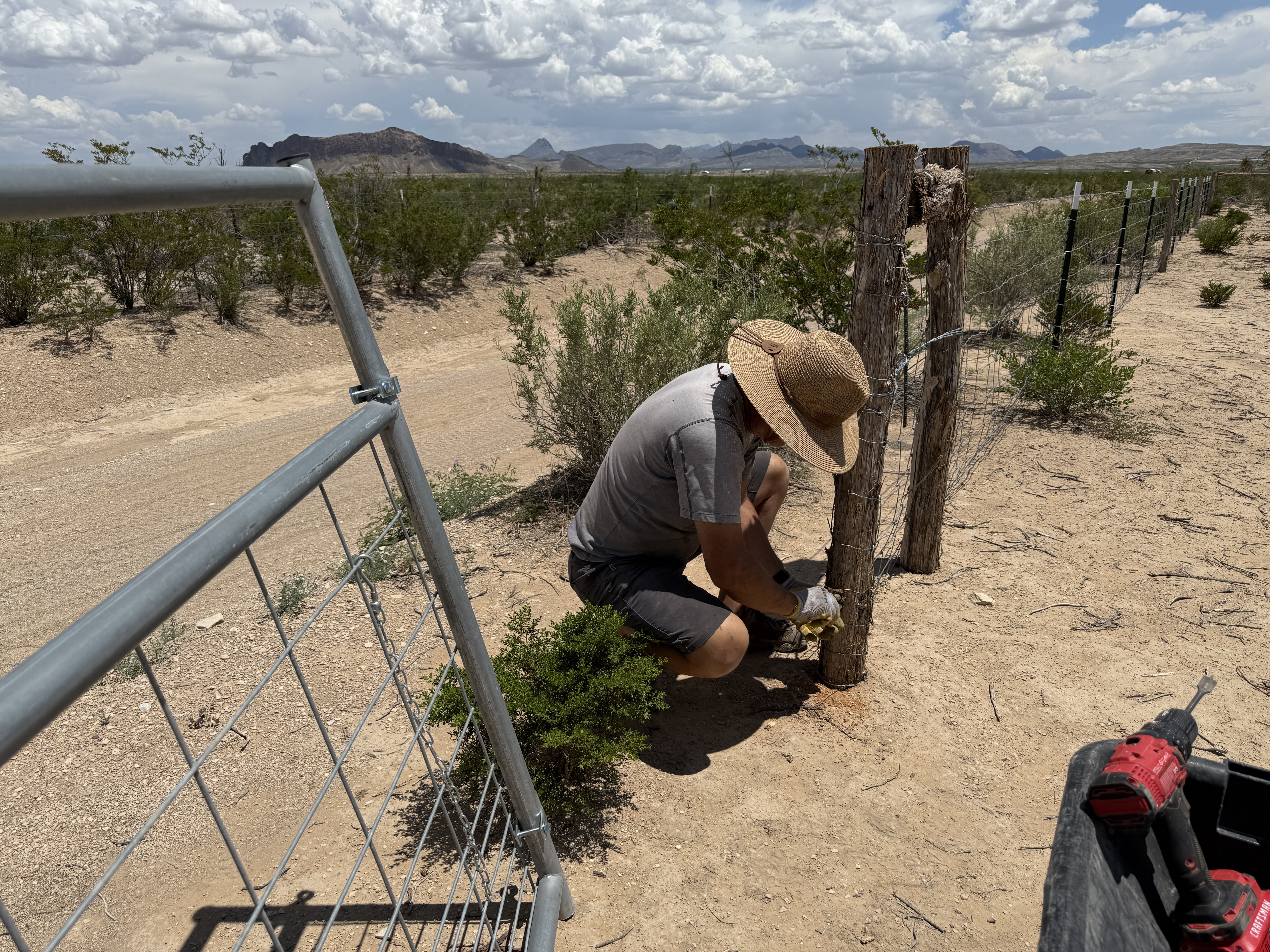 Doyle helped me complete the final 660-feet of fencing on the north tract. The cedar posts and metal t-posts have been in place for two years. I bought the final two rolls of field fence for this tract at Tractor Supply in Katy. Doyle and I managed to stretch, install, and clip-in both rolls under the searing Big Bend summer skies. Took us two days and gallons of Gatorade but we got it done.