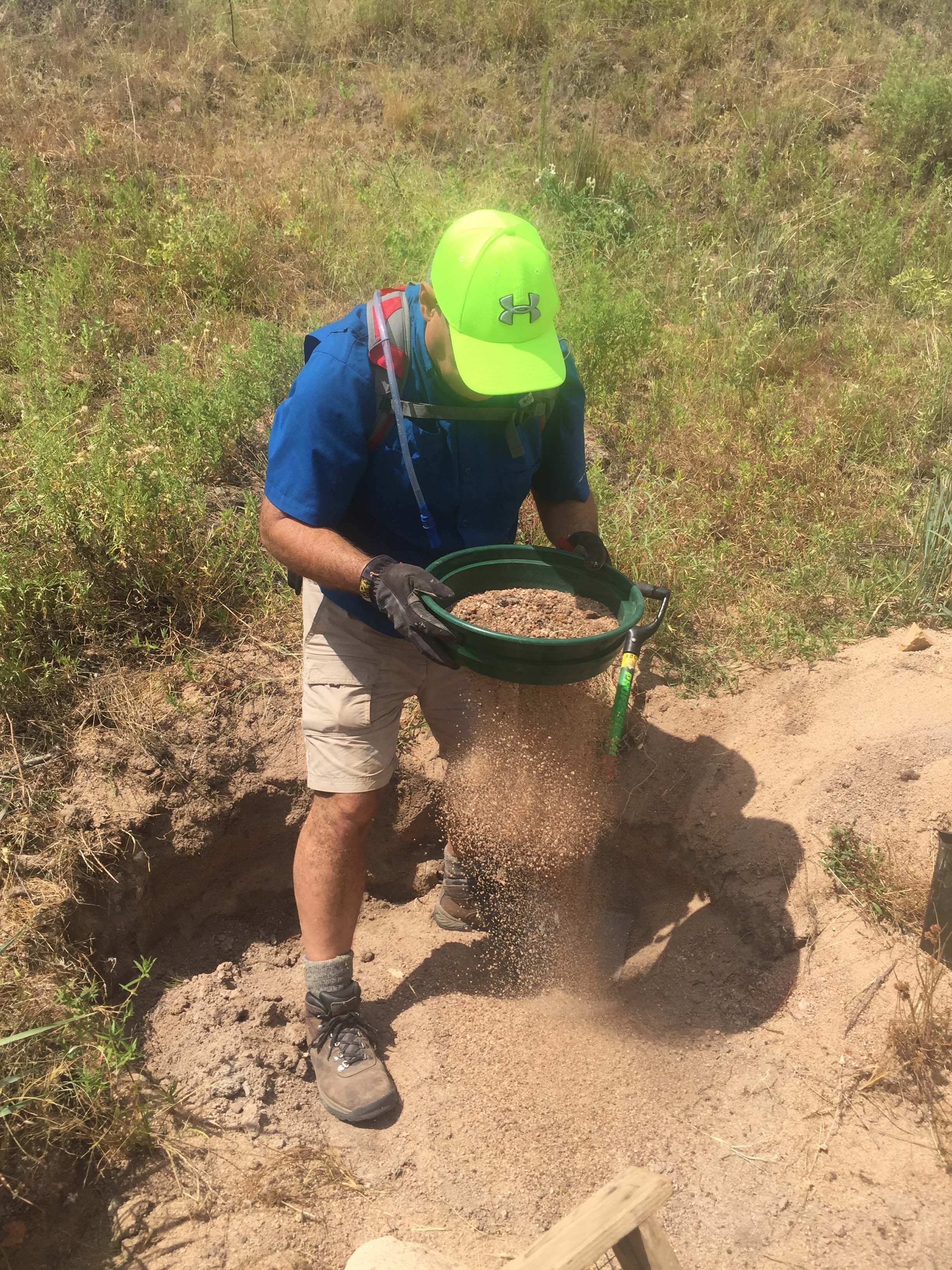 After our orientation, we set up our base camp — our canopy, camp chairs, and ice chest filled with fruit, water, and gatorade to beat the heat. And then we collected our gear and set off for the creek bed. We worked an hour at a time, digging and sifting material in our soil sifters. We found lots of pretty rocks and some that might be topaz. We’ll know more when we’ve had time to clean and examine our haul.