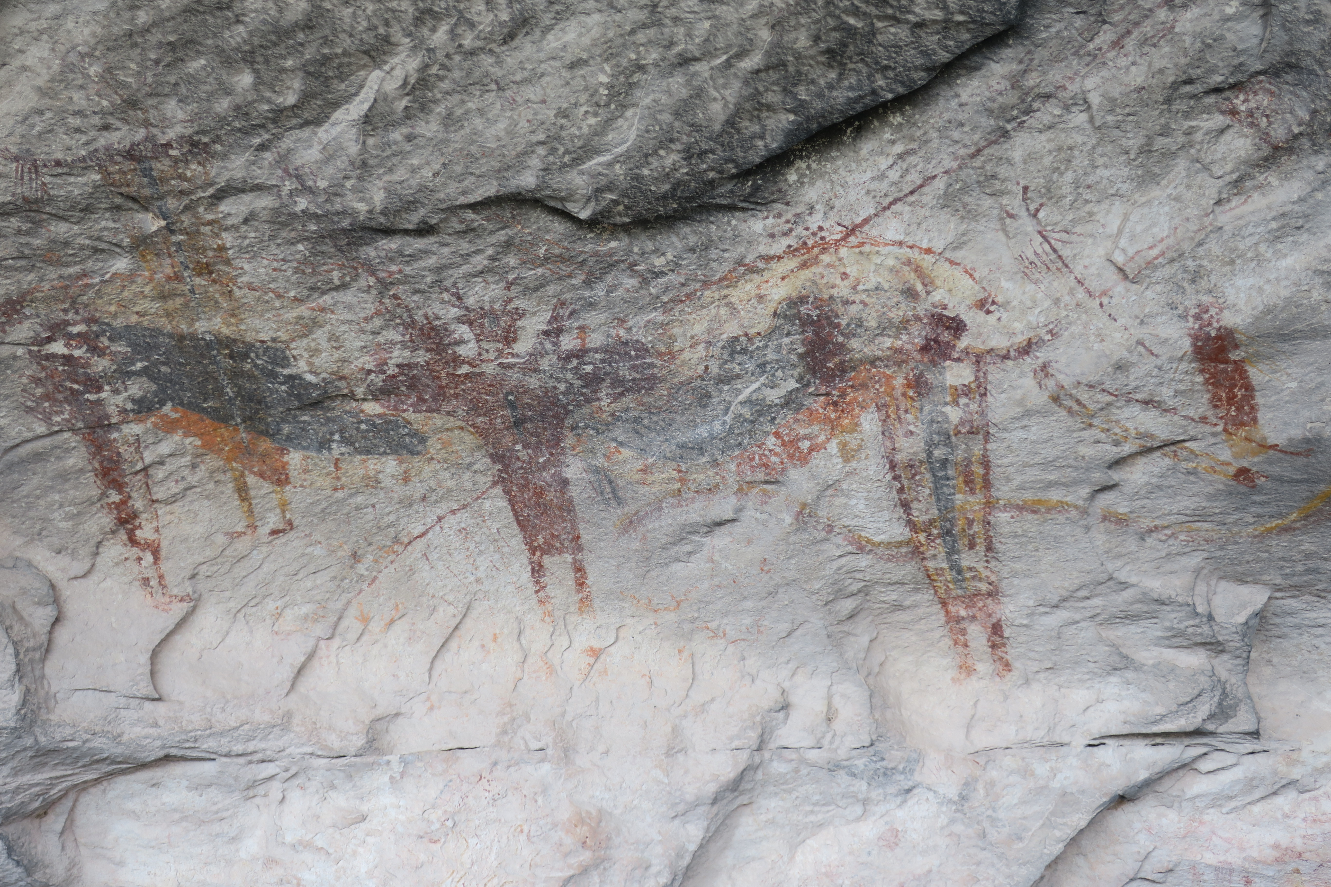 There are more than 200 pictograph sites in the area that contain single paintings and panels of art hundreds of feet long. The pictographs depict animals, birds, weapons — and also human, anthropomorphic, zoomorphic, and enigmatic figures.
