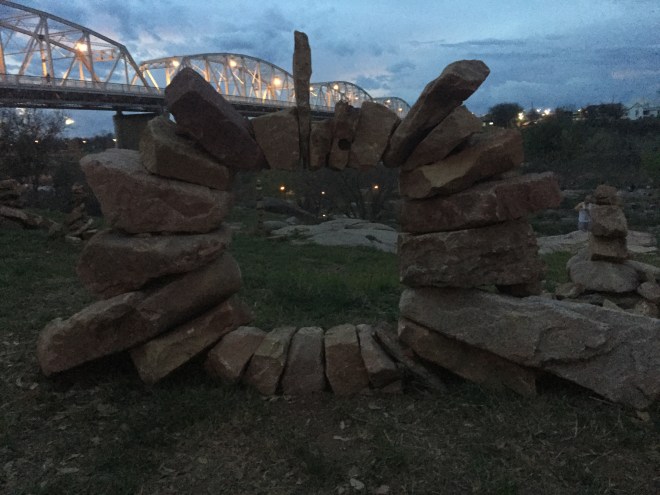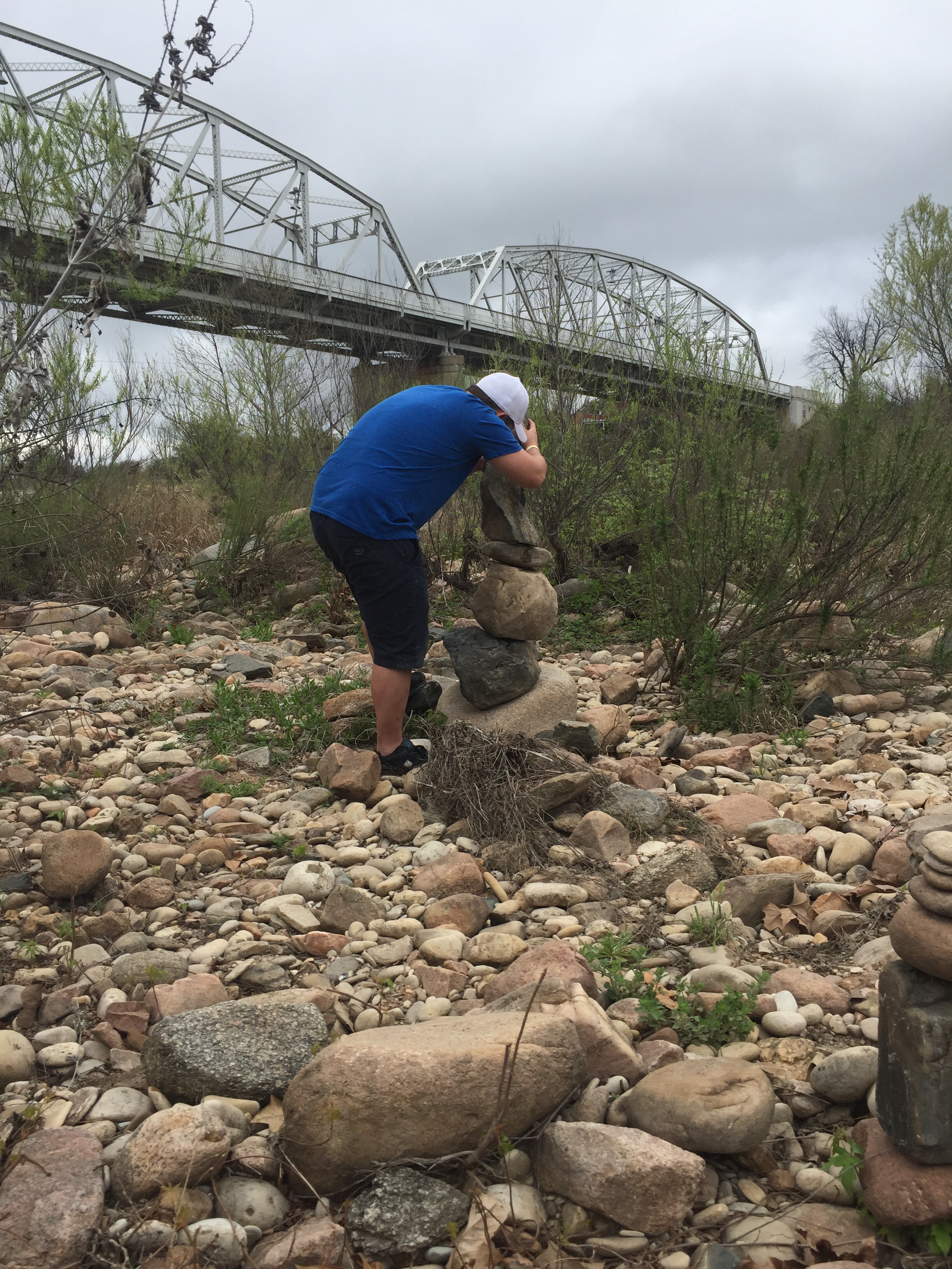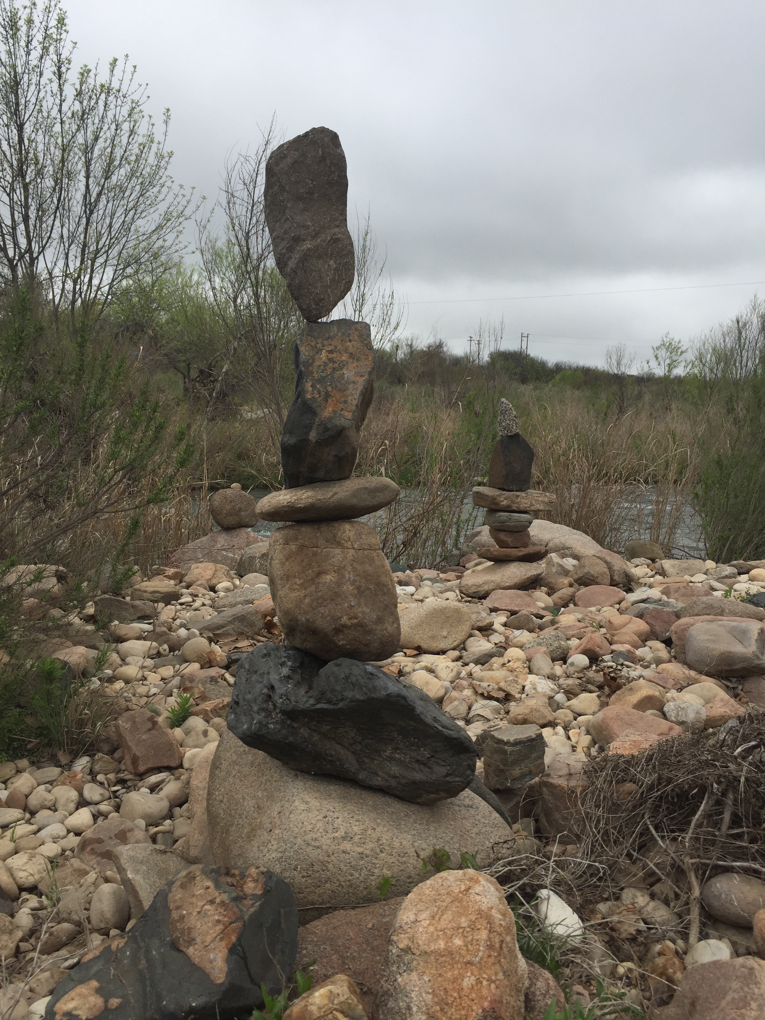 At the heart of the Llano Earth Art Fest is something that is near and dear to my son’s heart — rock stacking! Jonathan started stacking rocks for fun about ten years ago and has left his temporary cairns along the banks of many a Texas river. I can barely stack one sheet of paper atop another so I am quite impressed by anyone who can stack rocks. I thoroughly enjoyed watching Jonathan and folks from all over the country and a few nations do the same.