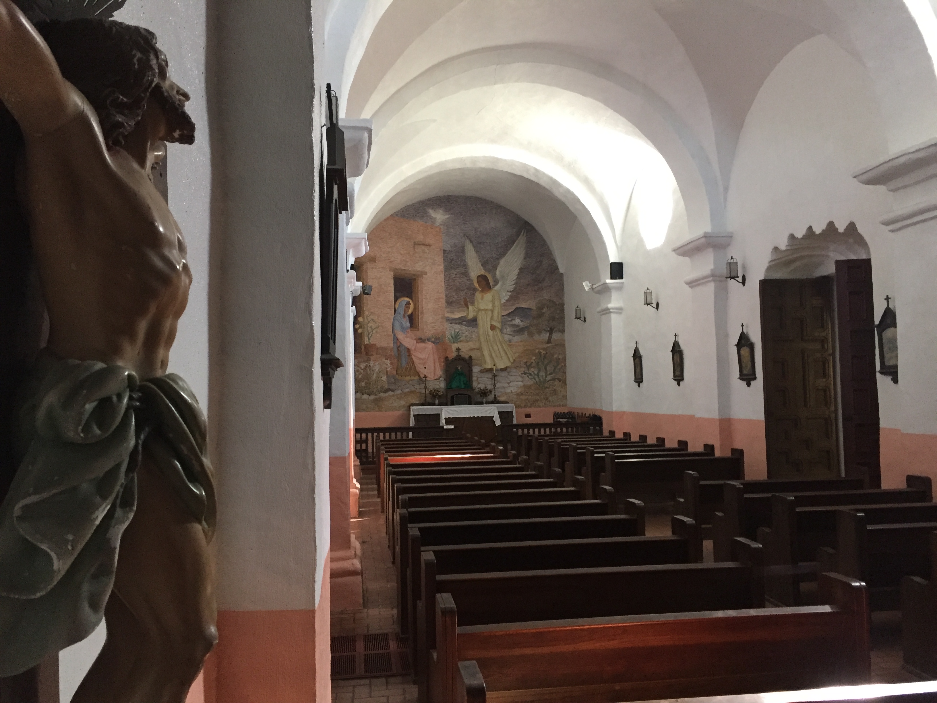 Like the other painted churches in the area, St. John the Baptist Catholic Church has a beautiful and worshipful interior. The altar is a masterpiece of carpentry. The walls on either side are adorned with the familiar stations of the cross that portray the events of the Passion of Christ. The welcoming angel statues at the entrance of the church hold sea shell shaped containers of holy water for those who come to pray and worship.