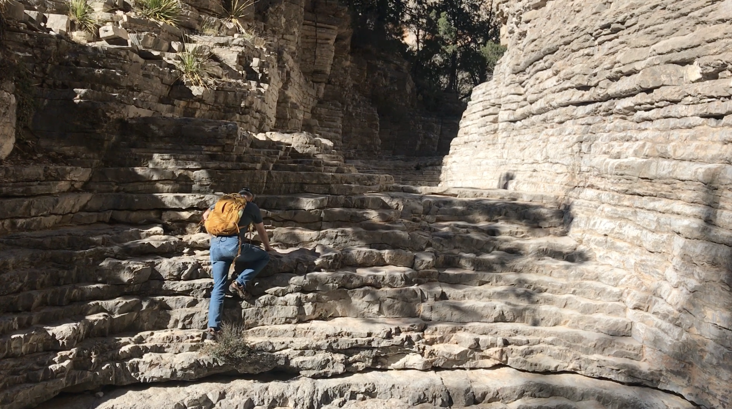 The trail begins at the Pine Springs campground and is well-defined for the first couple of miles. The trail eventually leads to a canyon wash that is filled with scree and boulders. No danger of getting lost, however, as long as you stay in the stream-bed. This wash leads to a stair step series of ledges called the Hiker’s Staircase.