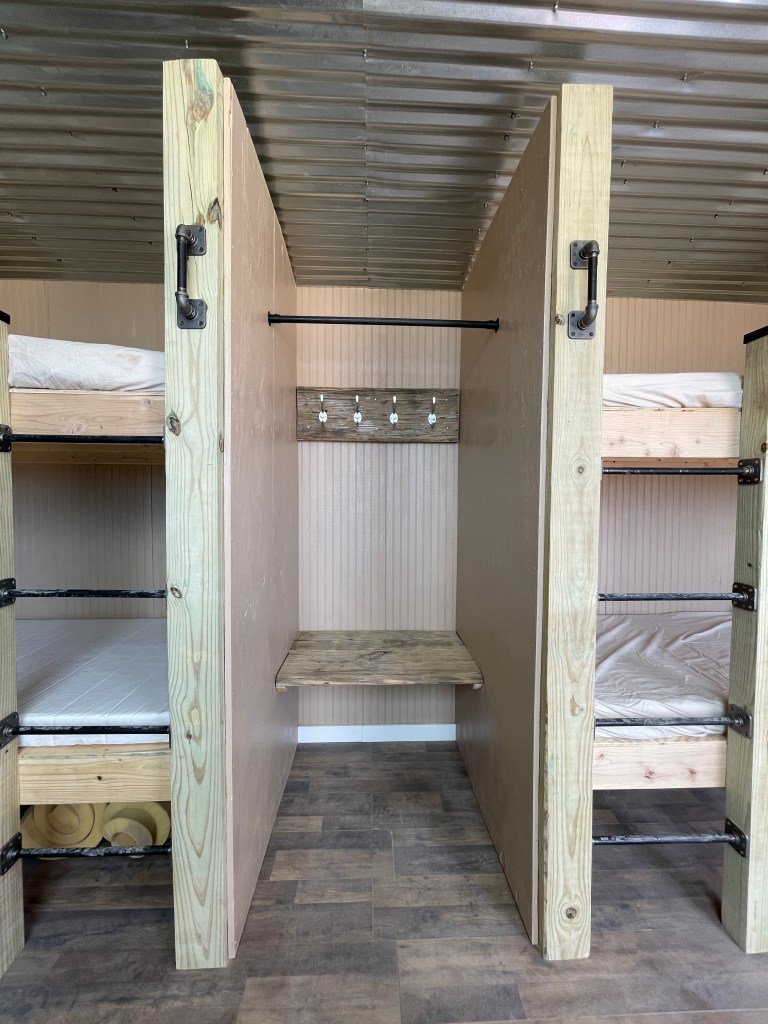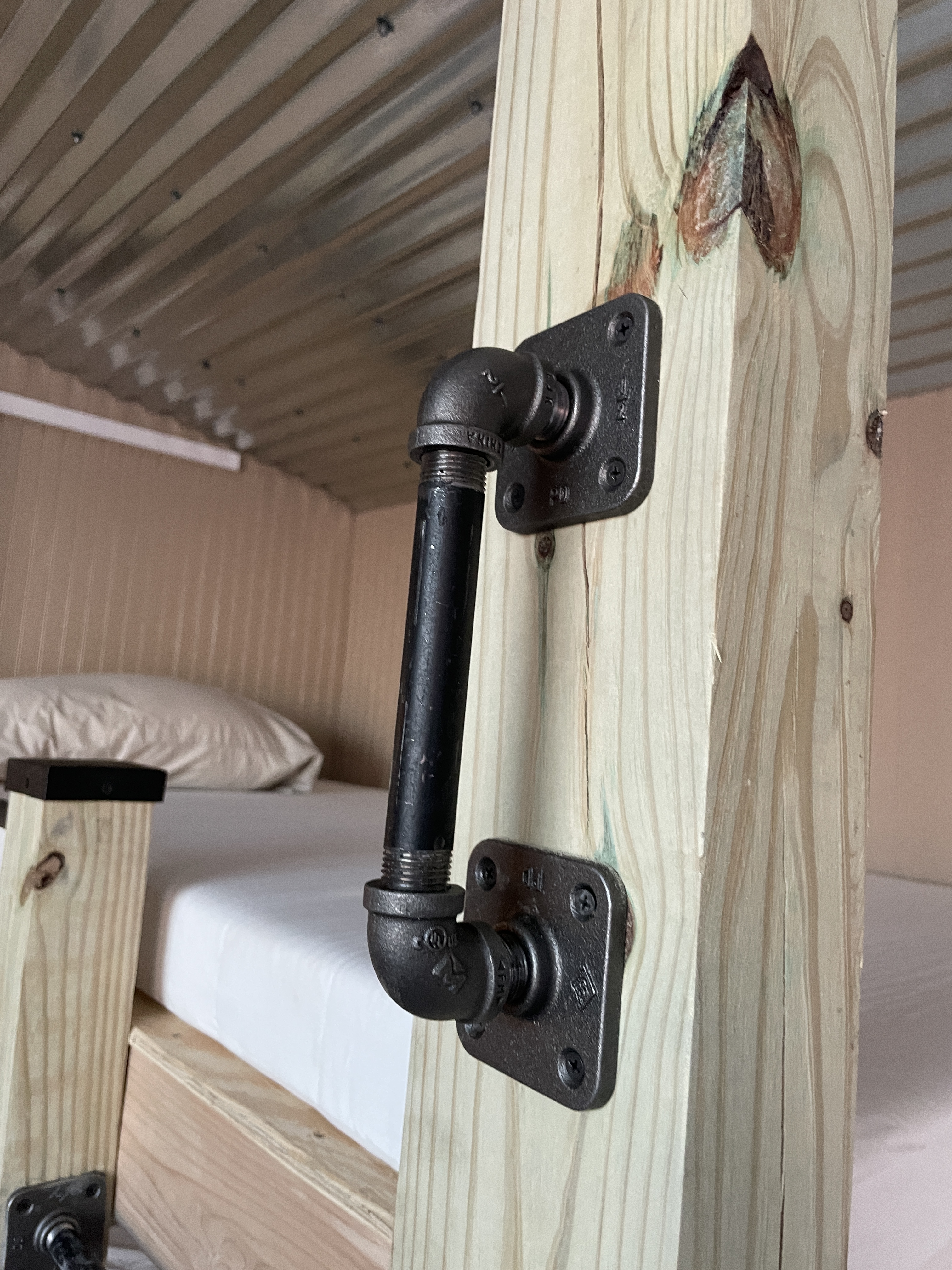 The bunk bed build was a fun project. We were able to build both sets of bunks beds. I decided to use black iron pipe and flanges to make the ladder to the top bunks. On our next trip I will install a grab bar and add a safety bar to the top bunks, all using black iron. The final step will be to build an open storage closet between the bunk beds so guests can have a place to stow gear and hang clothes.