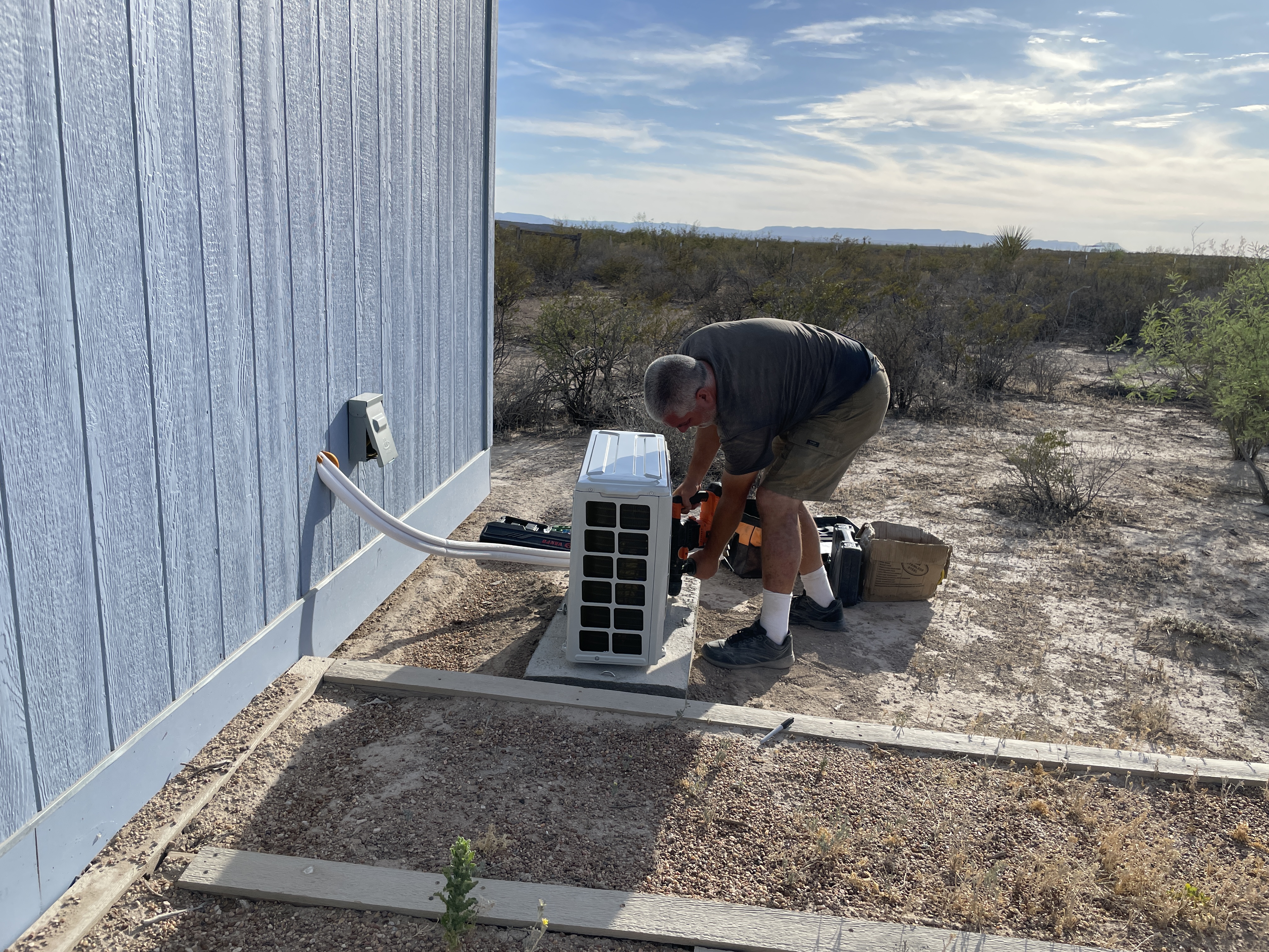 My neighbor Joe, the jack-of-all-off-grid-skills, stopped by to finish the install of the mini-split. He wired things so that we can run the mini-split off a generator while we wait to set up our solar panels. Wow! The mini-split did a great job of quickly cooling the well-insulated space in spite of the triple digit temps.